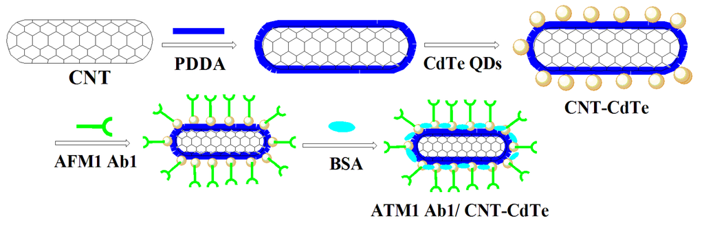 Graphene oxide (purity 99.9995%) and single carbon nanotube were obtained from Aladdin Chemistry Co. Ltd. (Shanghai, China). Aflatotoxin M1 (ATM1) was purchased from sigma Co. Ltd. (St. Louis, MO, USA). CdTe was synthesized according literature [12]. Milk samples were obtained from local supermarkets. The monoclonal antibodies against ATM1 (MAb) were purchased from Maine Biotechnology Services (Meridian Life Science, Inc., Memphis, TN, USA). Casein, bovine albumin (BSA), Tween20, potassium permanganate (KMnO4, 98 wt%), sulfuric acid (H2SO4, 98 wt%), phosphorus pentoxide (P2O5, 99 wt%), hydrogen peroxide (H2O2, 30 wt%), hydrochloric acid (HCl, 37 wt%) and potassium peroxydisulfate (K2S2O8, 99 wt%) were obtained from Shanghai Chemical Reagent Co. Ltd. (Shanghai, China). All reagents were of analytical grade and were prepared using deionized water.
