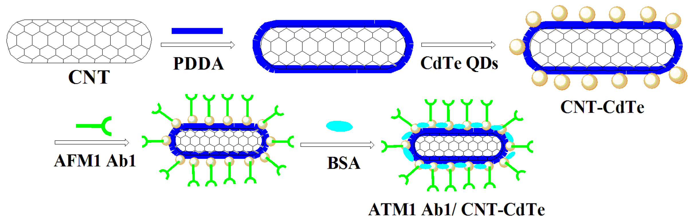 The synthesis steps for ATM Ab1/CdTe-CNT signal tag.