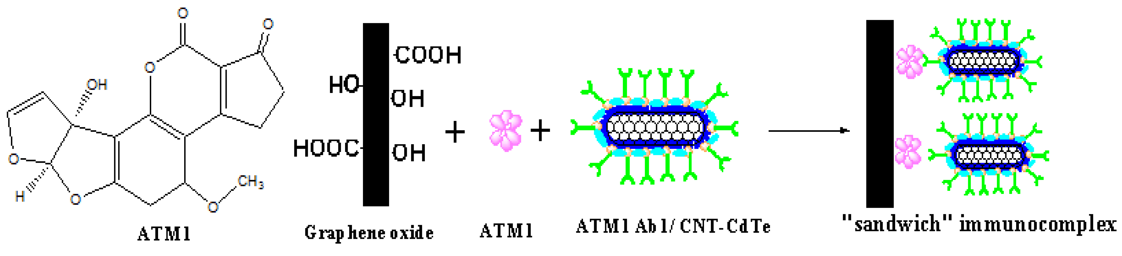 Another key issue for the ECLIA sensor is to choose a convenient method for immobilizing the signal probe on the electrode and maintain the biocompatibility of the antibody to greatest extent. However, it is very difficult to achieve the aim, because whatever the chemical grafting or physical adsorption method employed, it can inevitably generate deactivation to antibody and reduce its identification ability for antigen. And once the antigen is conjugated with the antibody, it is difficult for the electrode to be reused. Moreover, the antibodies are very expensive. Thus, if a kind of material with recognition feature for ATM1 can be utilized to immobilize on the electrode instead of the antibody, a label-free ECL electrode would be obtained, which will greatly reduce the cost and simplify the fabrication process. Graphene oxides (GO), as one kind of flat monolayer of carbon atoms tightly packed into a two-dimensional honeycomb lattice, has come to the forefront of research in electrochemical sensors recently, because of its unique electronic properties and high electrical conductivity [15,16]. Furthermore, GO can also been served as an extraordinarily wonderful adsorbent material for enriching aromatic organic compounds in a complex matrix [17]. Because ATM1 is a compound with a large aromatic ring, GO will thus be used to absorb ATM1 and separate the ATM1 from the tested samples in this paper. Furthermore, the ATM1 Ab1/CdTe-CNT signal tag can be employed to conjugate with the ATM1 absorbed on GO to form a “sandwich” immunocomplex (GO/ATM1/ATM1 Ab1/CdTe-CNT), which can generate ECL signal on the electrode. Certainly, other aromatic ring-containing substances can also be adsorbed on the surface of GO. However, the signal tag labeled with ATM1 Ab1, cannot react with other absorbed matter other than ATM1. Thus the ECL signal can only reflect the amount of ATM1 enriched on GO. The “sandwich” detection scheme (Scheme 1) is significantly different from the conventional competitive enzyme immunoassay (cELISA) for toxin. Firstly, when the concentration of ATM1 is increased, the proposed method will generate an enhanced detection signal, while the signals in cELISA decrease, because less enzyme-labeled antigen as competitive substances would bind to the bottom of the microplate, which can catalyze the substrate to produce the signal. Usually, most of the interference substances (such as protein and lipid) in food samples have high resistance, which can decrease the electrochemical signal. Therefore, the new immunoassay results can better reflect the real content of the analyte. Secondly, the scheme is similar to double-antibody sandwich reaction with two recognition sites (one from GO, and the other from the antibody on the signal tag), which will have higher recognition ability for ATM1 than competitive ELISA with only one recognition site. To the best of our knowledge, no report about establishing ECL immunoassay on the above “sandwich” scheme has been published.