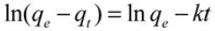 Where k1 (g mg−1 min−1) is the pseudo second-order rate constant. Based on the two models, curve fitting was performed and the parameters in the models and regression coefficients (R2) for the two kinetic models were obtained. The Lagergren-first-order rate constant k and Q1 can be determined from the intercept and slope of the plot obtained by plotting Ln(Qeq− Qt) versus t; the Pseudo-second-order rate constant k1 and Q2 can be determined from the intercept and slope of the plot obtained by plotting t/Qt versus t. The calculated parameters for Lagergren-first-order model and Pseudo-second-order model and the correlation coefficients (r2) are listed in Table 1.