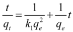 Where qe is the amount of ATM1 (mg/g) adsorbed per unit mass of adsorbent at equilibrium, qt is the amount of ATM1 (mg/g) adsorbed at time t (min−1), and k is the equilibrium rate constant of pseudo first-order. The pseudo second-order model can be expressed as Equation (2):