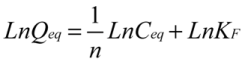 The Freundlich isotherm describes the equilibrium on a heterogeneous surface. Therefore, it was regarded as a physical adsorption combined with the effect of chemical adsorption. The isotherm is described by the following equations: