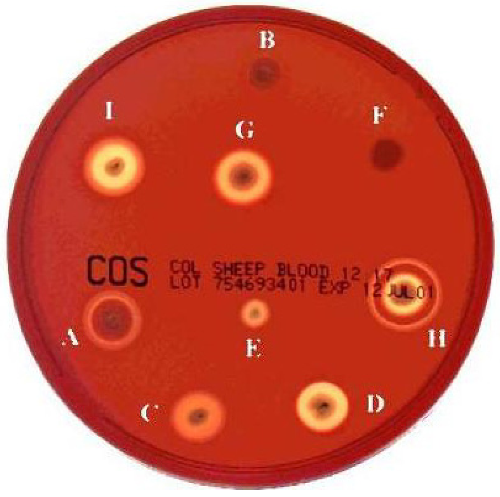 Haemolytic types (HT) for B. cereus and B. thuringiensis strains isolated from small soil samples. Haemolytic activity was determined at 30 °C on sheep blood agar plates. All 198 strains were plated on blood agar at the same time and compared after 15 h. The haemolytic activity of each strain was estimated twice, and each replicate was classified “blind” with respect to the previous one. Nine different haemolytic types (A to I) were identified among the 198 strains [31].