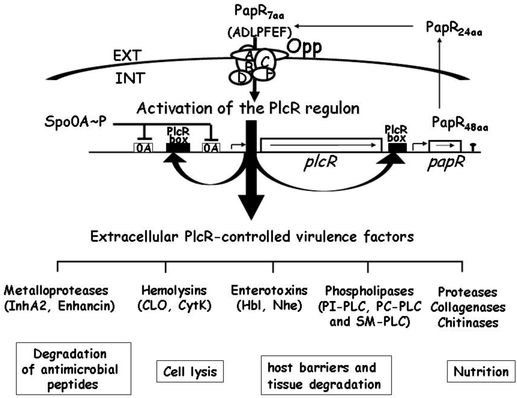 In B. cereus and B. thuringiensis, the expression of CLO and TLO is controlled by the transcriptional activator PlcR [48,49]. PlcR was originally identified as a transcriptional activator of plcA, the gene encoding phosphatidylinositol-specific phospholipase C [50]. For activity, PlcR requires PapR, a peptide expressed as a propeptide under the control of PlcR, which is exported out of the cell, processed to generate an active heptapeptide, and re-imported into the bacterial cell through the OppABCDF oligopeptide permease system (Figure 3) [51,52]. The PlcR/PapR system is now known to be the central transcriptional regulator for virulence genes in B. cereus at the onset of the stationary phase [53,54]. It controls the expression of a large regulon comprising at least 45 genes, including degradation enzymes, cell-surface proteins and toxins, most of which may be considered potential virulence factors [55].