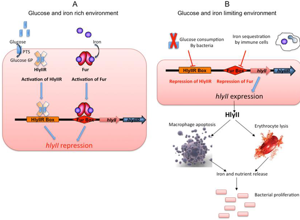 Model of the role and expression of hlyII during infection (A) As long as iron and glucose are abundant in the bacterial environment, glucose enters the bacteria as glucose 6P (blue rectangles) and binds HlyIIR (plain orange cross). Iron (purple circles) binds Fur (red ovals). These binding events promote the repressor activities of HlyIIR and Fur, leading to the HlyIIR- and Fur-based transcriptional repression of hlyII gene expression (B) By contrast, when glucose and iron become scarce, hlyII expression is activated. HlyII is then released into the environment and induces macrophage and erythrocyte lysis. The dead cells release their intracellular content, providing access to metabolites that are essential for bacterial growth [75].