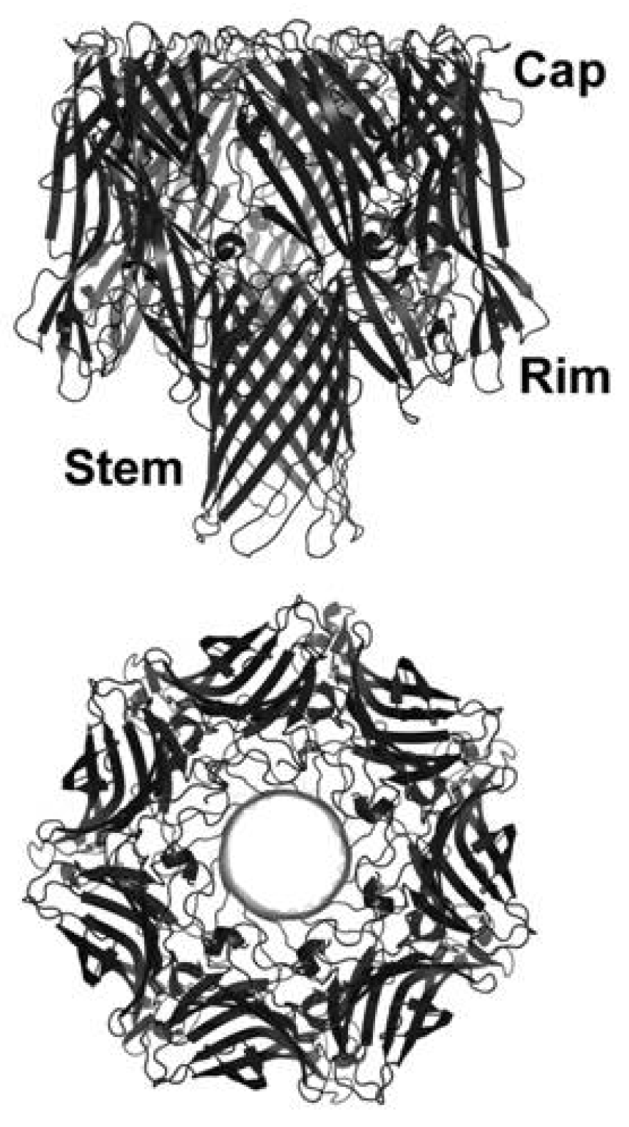 Early evidence suggested that α-toxin monomers aggregated into an oligomeric structure on the host cell surface. Electron micrographic images of Hla-treated cells or artificial liposomes led to the discovery of ring-like structures 10 nm in diameter with 6–7 subunits and a central pore of approximately 2–3 nm [56,57,63,64,65,66,67]. Initial biochemical studies, including purification of membrane-bound oligomers, led to the determination that α-toxin formed stable hexamers [56,68,69,70]. Gouaux and colleagues clarified these observations, employing X-ray diffraction analysis to propose a heptameric toxin structure [6]. This heptameric structure was confirmed in 1996 when Song and colleagues solved the crystal structure of the fully assembled toxin pore (Figure 1, [5]). The holotoxin is described to encompass three broad domains: (1) the cap domain on the extracellular face of the toxin, exposed to the aqueous environment, defining the entry of the pore; (2) the rim domain that is juxtaposed to the outer leaflet of the host plasma membrane; and (3) the stem domain that forms the membrane-perforating β-barrel pore [5].
