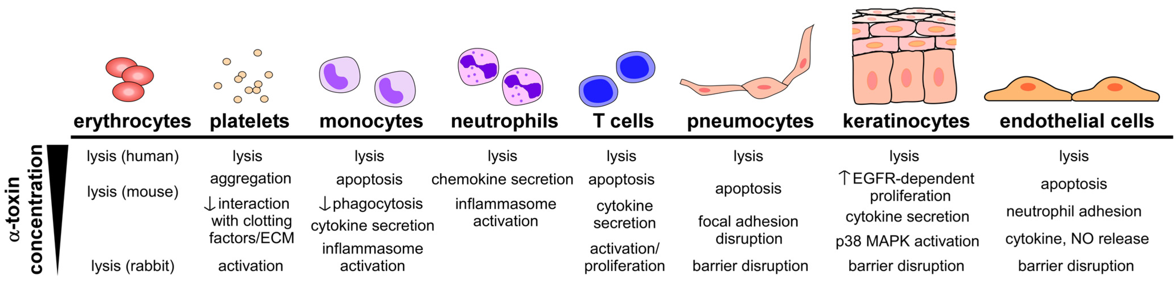 Cellular responses to intoxication by Hla. Multiple cell types are targeted by α-toxin, each displaying unique effects that are dependent on the relative concentration of toxin to which the cell is exposed.