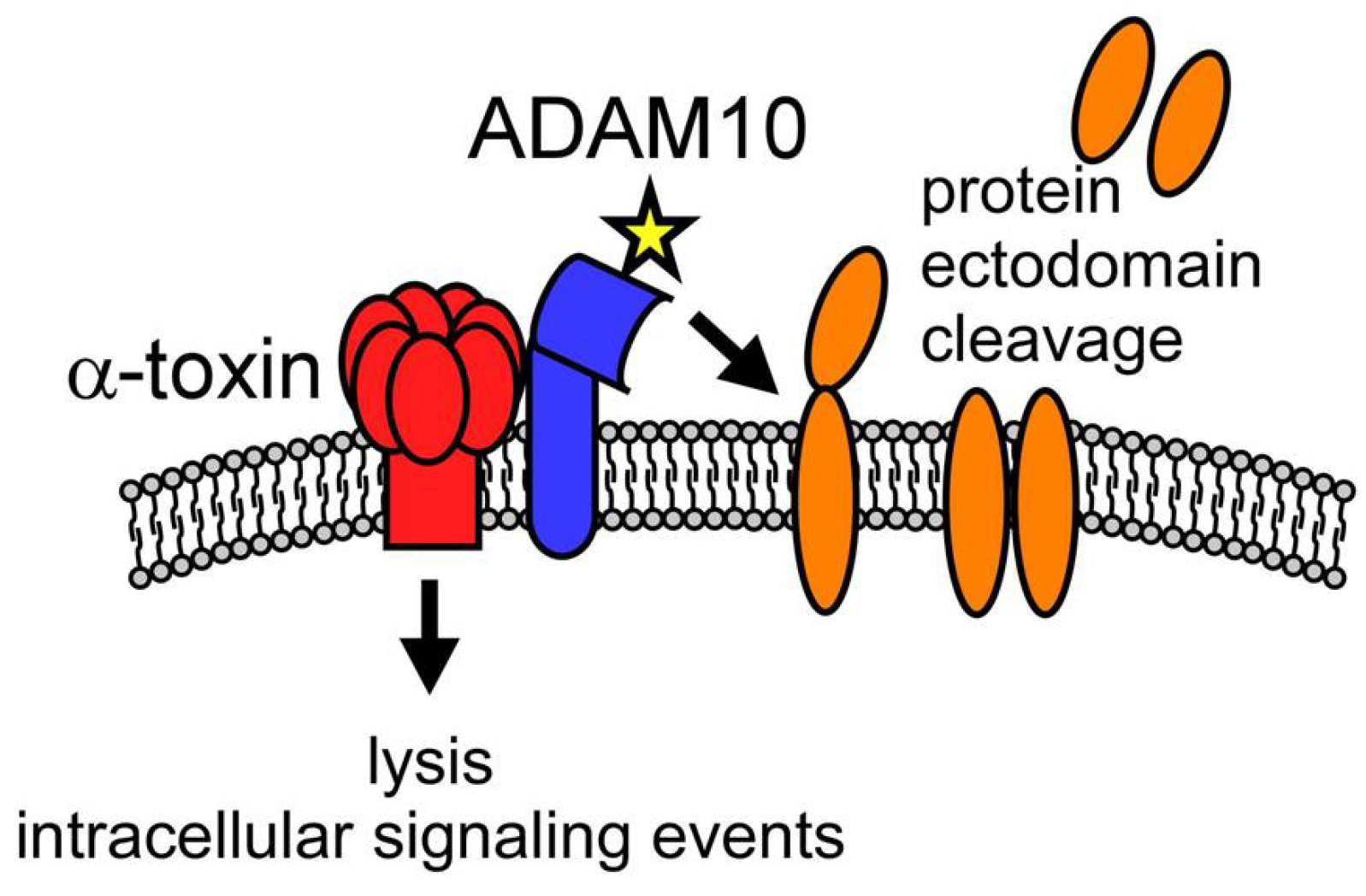 Dual mechanism of action of α-toxin on susceptible host cells. Model illustrating key functions of the α-toxin (red)-ADAM10 (blue) complex, facilitating membrane binding of the toxin with subsequent oligomerization and pore formation. The formation of the toxin pore leads to two functionally linked outcomes—induction of host cell signaling and/or cellular lysis (dependent on toxin concentration) and the rapid upregulation of the metalloprotease activity of ADAM10 (denoted by a star). ADAM10, in turn, acts in a cell-specific manner to cleave ectodomain-containing proteins (orange) that appear to represent important biological mediators of α-toxin action.