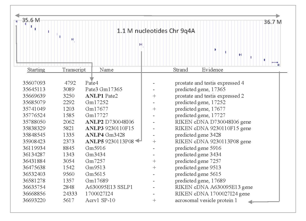 Gene organization in mouse chromosome, 9qA4. A chromosomal region that covers 1.1 million nucleotides (position 35.6–36.7 M) is shown. This region covers testis related genes and previously uncharacterized short proteins. Applying structural prediction methods indicates that this genomic segment is rich with TOLIPs that belong to the TFP fold. The chromosomal arrangement is in accord with a recent duplication event. The information for each putative gene is summarized as follows: starting nucleotide: 35607093; transcript length: 4792 nucleotide; gene name: Pate4; strand orientation: -; detailed name: prostate and testis expressed 4.
