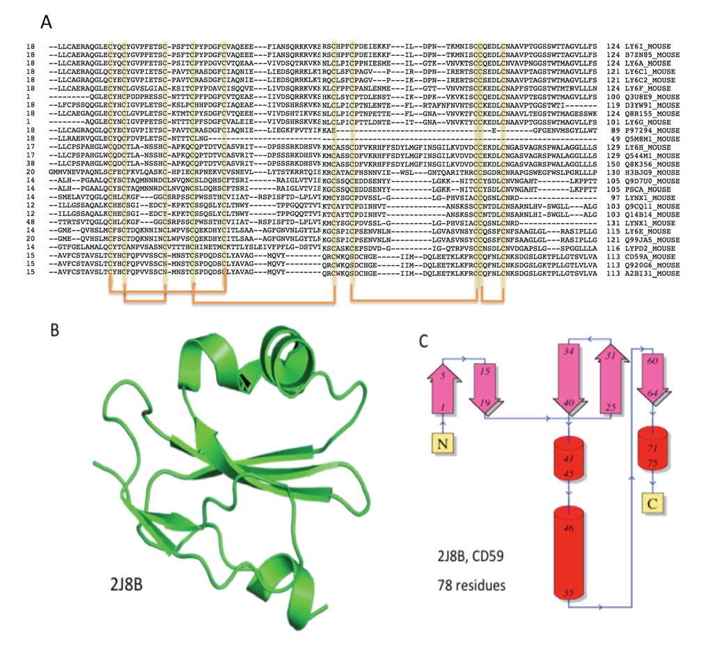The Ly-6/uPAR/α-neurotoxin domain. (A) Multiple sequence alignment of 28 proteins that contain a single LU domain from mouse. All Ly-6 related proteins are localized within 0.9 million nucleotides from chromosome 15 (position 74.7 M–75.6 M). The 10 conserved cysteines that form five-disulfide bridges are marked (below the sequences); (B) A representative fold for the Ly-6/uPAR/α-neurotoxin is the 3D structure of human CD59. This fold is a prototype for listed proteins of the LU domain; (C) The secondary structure organization of 78 amino acids of the human CD59 is shown. A similar organization of β-sheets and short α-helices is found in other proteins of the LU domain.