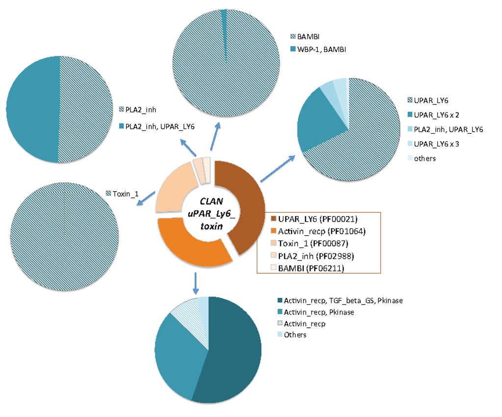 The Pfam database is a large collection of protein families. Pfam clans represent the relatedness among protein families, where each clan unifies at least two domain families [27]. Figure 4 shows the relative size of each of the domain families that compose the uPAR/Ly6/CD59/snake toxin-receptor clan (CL0117). This clan includes organisms throughout the phylogenetic tree. The largest domain family in this clan is the UPAR_LY6 (PF00021). The family of Toxin_1 composes of elapid toxins. These snake toxins (Pfam family Toxin_1) are mostly short proteins with a single domain. Interestingly, PLA2_Inh (Phospholipase A2 inhibitor [28]) is an additional family that belongs to the same clan (CL0117). Many PLA2 are active components in venoms. The fifth domain family in this clan is the BAMB1 (BMP and activin membrane-bound inhibitor N'-terminal domain).