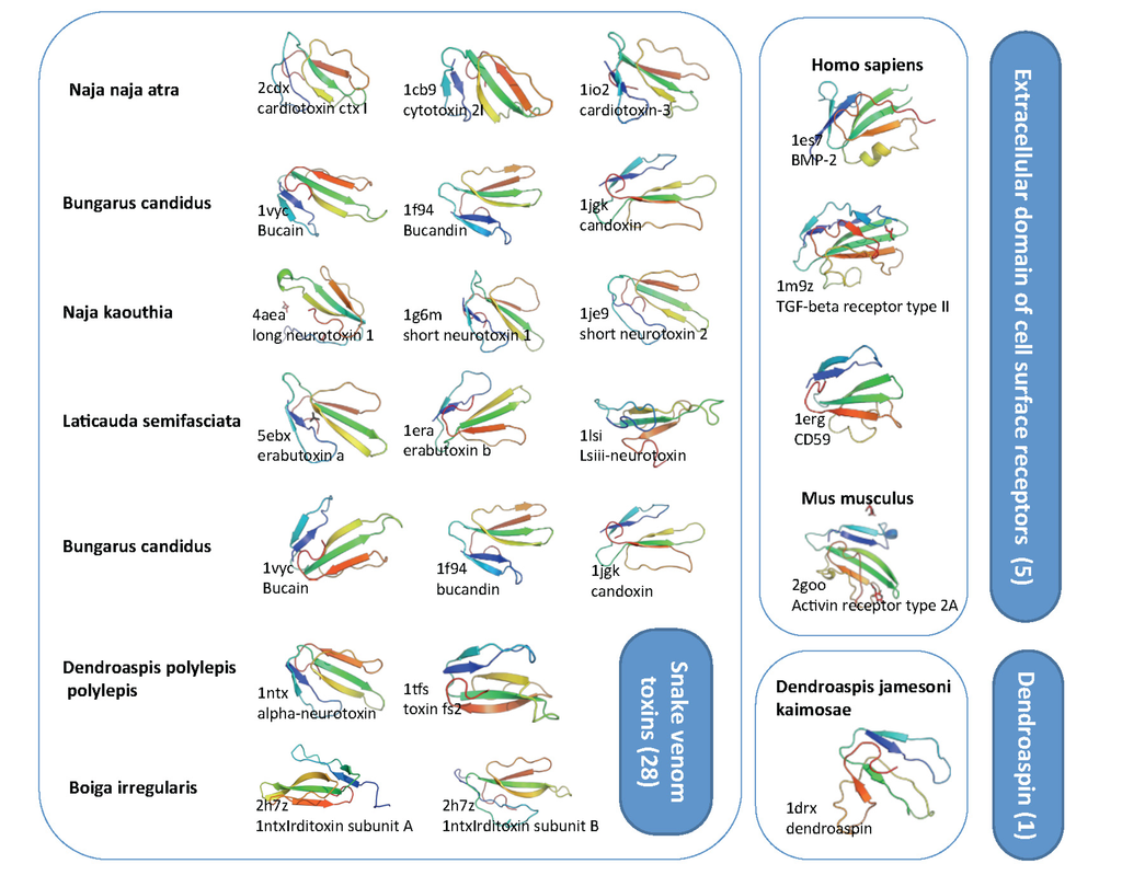 Structural view on toxin-fold (SCOP g.7.1). SCOP classification is based on SCOP 1.75B. There are three families that compose the superfamily g.7.1 including: (i) g.7.1.1, snake venom toxins (28 protein domains) (ii) g.7.1.2, dendroaspin (one protein) and (iii) g.7.1.3, Extracellular domain of cell surface receptors (five protein domains). Representative examples are shown with their Protein Data Bank (PDB) identifier and the organism. The overall representatives share less than 40% sequence identity. Note that the structural similarity is high, with three loops and nearly all structure dominated by the β-strands. The length of most of these structural domains ranges from 65–85 amino acids.
