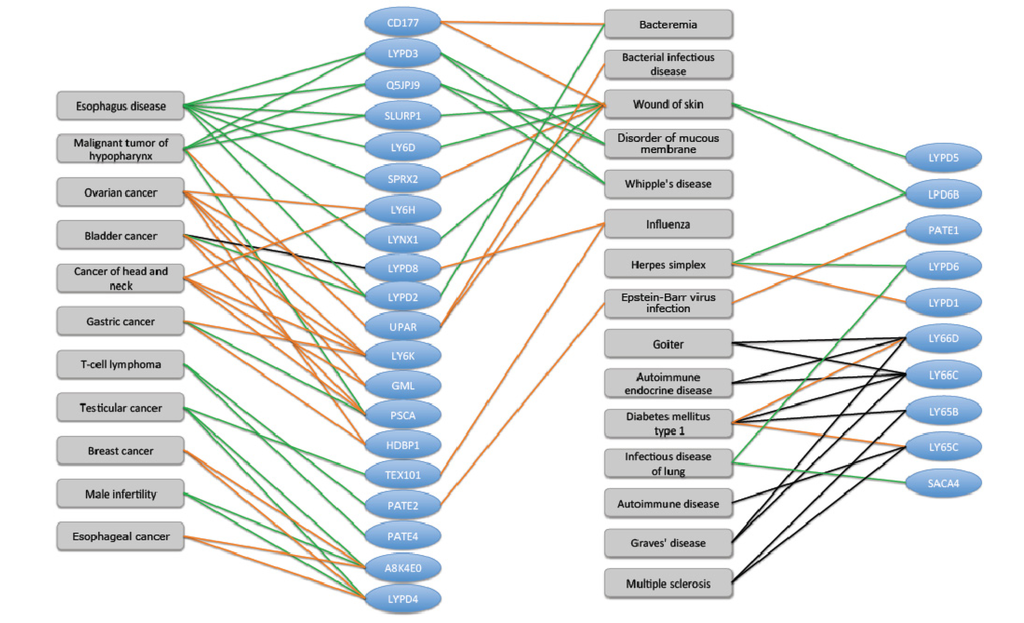 Cell surface proteins are often associated with cancer diagnosis’ markers. Numerous such clinical markers are GPI-anchored cell-surface proteins that belong to the Ly-6/uPAR family. In this view, some Ly-6 proteins were implicated as potential therapeutic drugs [52]. The significant biological association of the LU domain human proteins as markers for a large number of cancers, as well as to immunological-based pathologies, is shown in Figure 6.