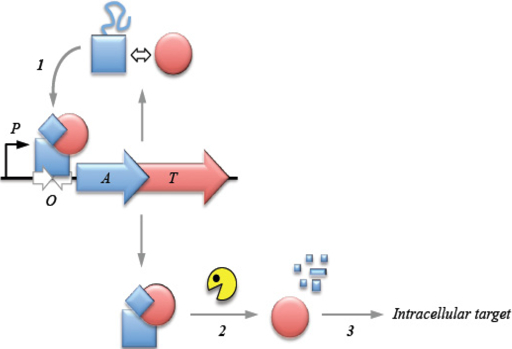 Action of a generic type II toxin-antitoxin (TA) complex in which both factors are proteins. The antitoxin (A) and toxin (T) genes are expressed in an operon. A poorly structured domain within the antitoxin protein is remodelled by the toxin to produce a stable complex that autoregulates operon expression at the transcriptional level (1); In response to certain environmental conditions, e.g., nutrient limitation or antibiotic exposure, the antitoxin is proteolytically degraded (2); The toxin is thereby released to act on its intracellular target to induce cell dormancy or stasis (3). P, promoter; O, operator.