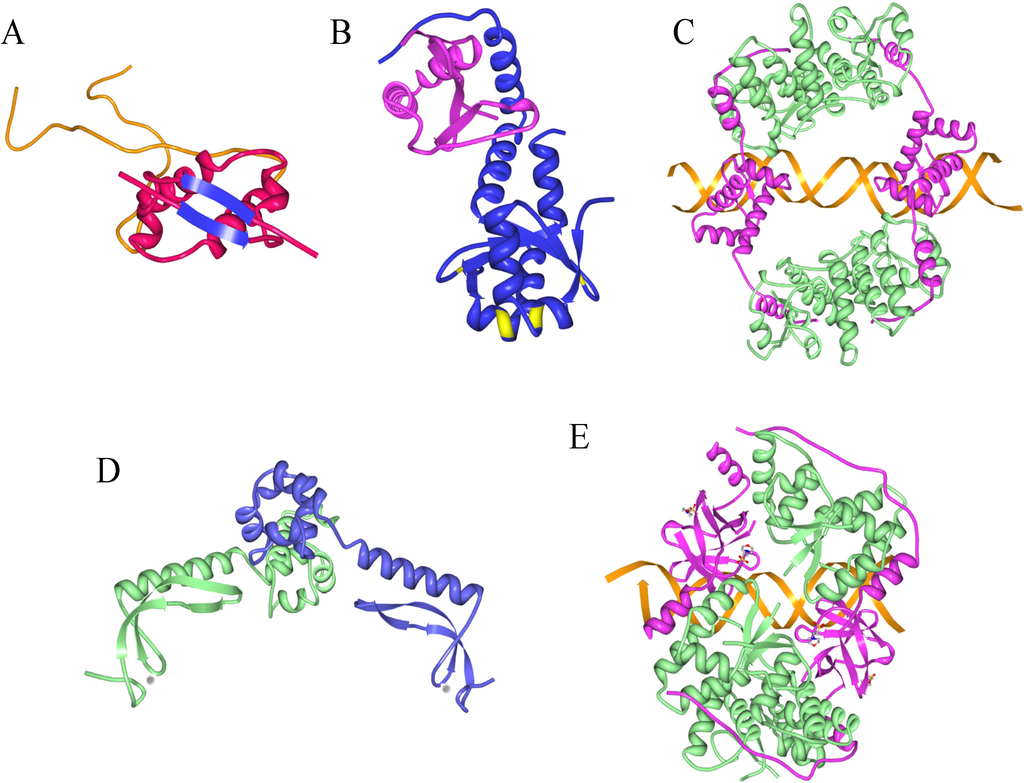 Tertiary structures of selected antitoxins and TA complexes. (A) solution structure of CcdA antitoxin [44]. The structure comprises a dimeric, N-terminal ribbon-helix-helix (RHH) fold (red and blue) that binds DNA connected to a pair of C-terminal extensions (orange) that become structured upon interaction with the CcdB toxin [44]. The antiparallel β-strands in the RHH fold that insert into the DNA major groove are highlighted in blue. (B) crystal structure of the YefM-YoeB complex [45]. The YefM antitoxin dimer and YoeB toxin monomer are coloured in blue and magenta, respectively. Conserved arginine residues in the N-terminal segment of YefM that are involved in operator recognition [46] are highlighted in yellow. (C) crystal structure of the FitA-FitB-DNA complex [47]. FitA and FitB are shown in magenta and green, respectively. The structure comprises four FitA-FitB heterodimers assembled on a 36-bp DNA segment (orange) from the regulatory region usptream of fitA-fitB. (D) crystal structure of the MsqA antitoxin [48]. Monomers within the dimeric structure are coloured green and blue. Zinc ions involved in maintaining MsqA structural stability are shown as red spheres. (E) crystal structure of the VapB2-VapC2 complex of Rickettsia felis [49]. The structure consists of four VapC toxin molecules (green) and four antitoxin monomers (magenta) which form a tetramer of heterodimers assembled on a 26-bp DNA segment. Images constructed using the Research Collaboratory for Structural Bioinformatics Protein Data Bank and the Molecular Biology Toolkit [50].