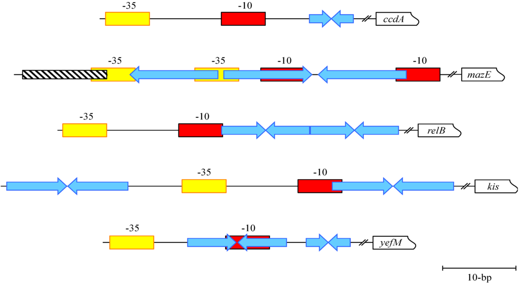 Organization of the promoter-operator regions upstream of the ccdA-ccdB, mazE-mazF, relB-relE, kis-kid, and yefM-yoeB TA genes (top to bottom). −10 and −35 promoter motifs are coloured red and yellow, respectively. Repeat sequences are denoted by blue arrows; the sequences of these repeats differ among the different systems. The FIS binding site in the mazE-mazF promoter region is shown as a hatched box.