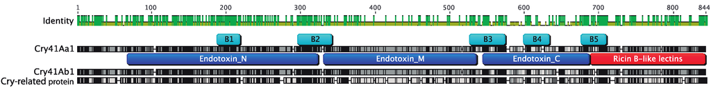 Figure 1. Alignment of parasporins (Cry41Aa1, Cry41Ab1) and the Cry-related protein deduced amino acid sequence. Light-blue bars (B1 to B5) indicate the conserved five amino acid blocks, Endotoxin (N, M and C) the three-conserved domains and ricin B-like lectin indicates the C-terminal conserved lectin domain found in the three protein sequences.