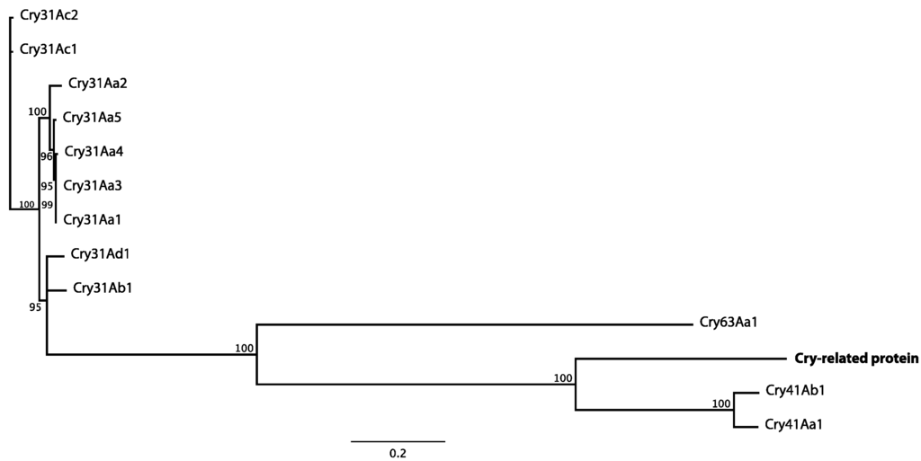 Figure 2. Dendrogram showing the relationship of a novel Cry-related protein to other parasporin (Cry) proteins. Bootstrap values are indicated at the nodes (100 replicates).