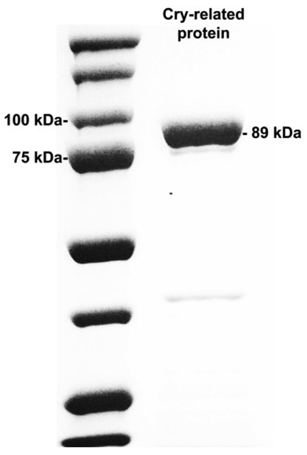 SDS-PAGE analysis showed that the novel Cry-related protein was successfully expressed in E. coli (Figure 3) and produced a major protein of the expected size (approx. 89 kDa) that was found in both the soluble fraction (active protein) and the pellet removed by centrifugation (data not shown), indicating that the recombinant Cry-related protein was produced in both soluble and insoluble forms (inclusion bodies) as result of overexpression.