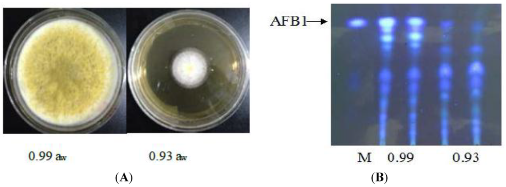 Effect of water activity on A. flavus growth and aflatoxin production. (A) Representative pictures of a colonial morphology from A. flavus at 0.99 aw (left) and at 0.93 aw (right). Strains were incubated at 37 °C for five days; (B) Extracts of the A. flavus grown for five days on YES medium. Extracts and aflatoxin standards were spotted onto silica gel TLC plates. The plates were visualized under 310-nm UV light.