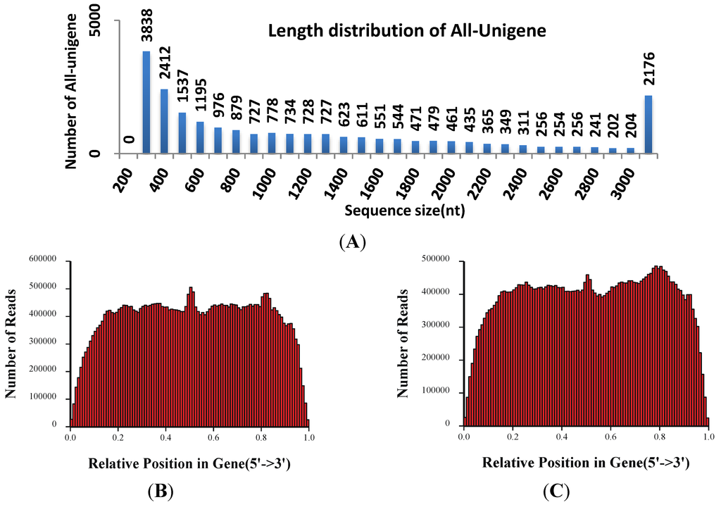 Length distribution and quality-control analysis of RNA-Seq data. (A) Length distribution of assembled unigenes; The length of unigenes ranged from 100 bp to over 3000 bp. The total read coverage along the gene body from 5' to 3' end in 0.99 aw (B) and 0.93 aw (C).