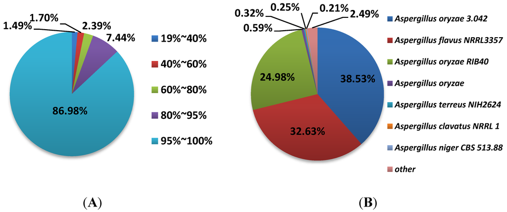 To understand the transcriptome of A. flavus, all unigenes were aligned against sequences from the NCBI non-redundant (nr) protein database by using the BLASTx algorithm with an e-value threshold of 10−5. BLASTx alignment analysis indicated that a total of 19,838 unigenes matched to known proteins in the Nr databases. Thus far, a total of 13,071 genes encoding proteins have already been annotated in the genome of A. flavus [30], whereas Lin et al. (2013) estimated that A. flavus has 14,510 genes by combining NCBI database with their RNA-Seq data [19]. However, the RNA-seq data presented in this work implies that more unigenes have the potential for translation into functional proteins, which serves to enrich the annotation of the A. flavus genome. A possible explanation for this phenomenon is posttranscriptional regulation, such as alternative splicing and RNA editing, enlarges their transcripts diversity [21]. Figure 3A,B show the similarity distribution of all unigenes in detail. The results indicate that 96.81% of all unigenes had an identification of more than 60% of the annotated genes. In a comparison with the nr database, we interestingly found that 38.5% of sequences matched to that of A. oryzae, but only 32.6% unigenes were well matched to that of A. flavus. However, Yu et al. (2008) found A. oryzae shared over 95% identity to A. flavus on the DNA level, and fewer than 300 genes were unique to each species [29].