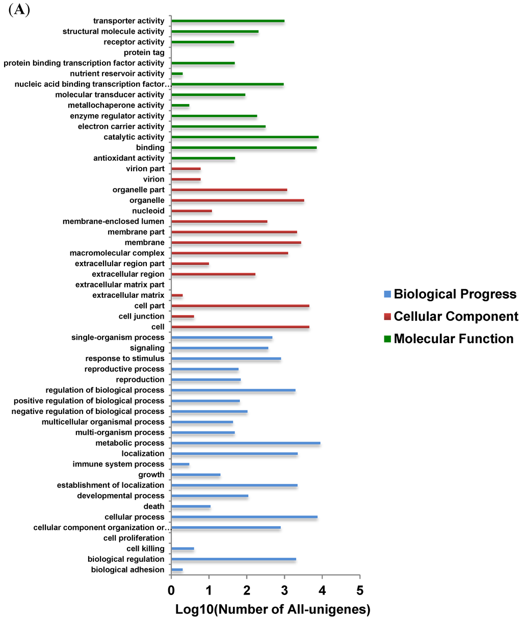 BLASTx alignment (e-value < 10−5) between unigenes and protein databases, including Nr, Swiss-Prot, KEGG, and COG, was performed, and the best alignment results were used to decide sequence direction of unigenes. If results of different databases conflicted with each other, a priority order of Nr, Swiss-Prot, KEGG, and COG was followed. When a unigene happened to be unaligned to none of the above databases, ESTScan (http://estscan.sourceforge.net) [22], a program that can detect coding regions in low-quality sequences, was introduced to decide its sequence direction. To obtain protein functional annotation, unigenes were aligned by BLASTx to protein databases (e-value < 10−5), and aligned by blastn to nucleotide databases nt (e-value < 10−5), retrieving proteins with the highest sequence similarity with the given unigenes. With Nr annotation, the Blast2GO program was used to obtain GO annotation of unigenes. After obtaining GO annotation for every unigene, WEGO software was used to perform GO functional classification for all unigenes and to understand the distribution of gene functions [23]. With the help of KEGG database, we could further study the genes’ biological complex behaviors, and using KEGG annotation we could obtain pathway annotation for unigenes.