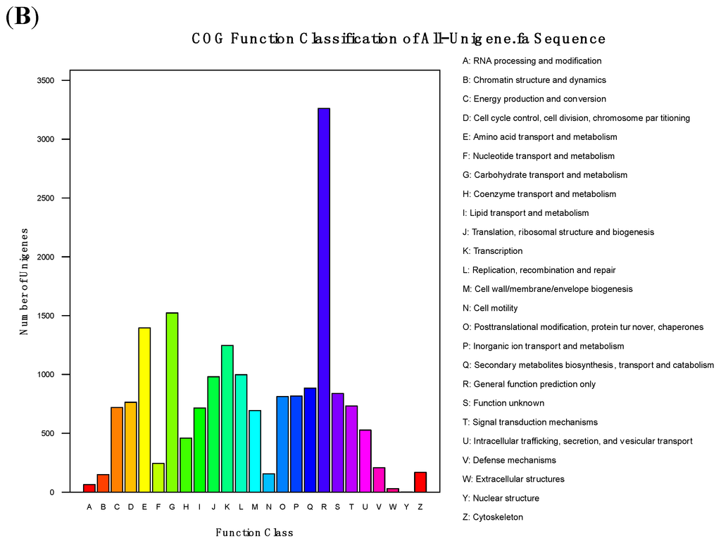 Annotation of all-unigene in the A. flavus transcriptome. (A) The gene ontology annotation of all-unigene; (B) Histogram presentations of clusters of orthologous groups (COG) classification.