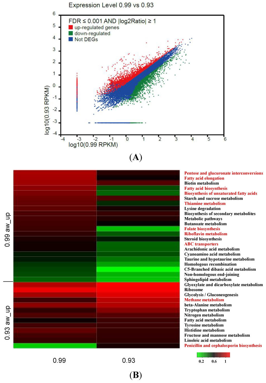 The different expression level of unigenes under different treatments. (A) Scatter plot of total unigenes from the A. flavus transcriptome; (B) KEGG annotation of DEGs. The heatmap shows 35 of 100 annotated pathways of DEGs between 0.99 aw_up and 0.93 aw_up. Among the 35 pathways, 19 pathways were up-regulated in 0.99 aw treatment, and the rest of the pathways showed up-regulated expression in 0.93 aw treatment. Different colors represent different expression level of a particular metabolic pathway during the two treatments. Green color represents down-regulated expression and red color represents up-regulated expression. Each row represents a differentially expressed metabolic pathway. The data used to construct this heatmap was based on the log10 value of the RPKM values of all unigenes relating to a particular metabolic pathway in 0.99 aw or 0.93 aw treatment. The top ten hits were shown with red words; (C) The gene ontology annotation of DEGs. Asterisks indicate a significant overrepresentation of functional categories compared to the functional categories of 3010 present genes (* p < 0.05; ** p < 0.01).