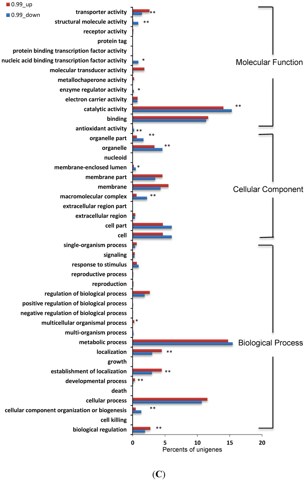 To identify the differences of molecular response between 0.99 aw and 0.93 aw treatments, gene expression levels were calculated using the RPKM method [22]. Based on RPKM values, out of 23,320 unigenes, 5362 differentially expressed unigenes (with p < 0.05, FDR ≤ 0.001, |log2Ratio| ≥ 1) were identified (Figure 5A). Among them, 3156 and 2206 genes displayed up-regulation under 0.99 aw and 0.93 aw treatments, respectively. All of the differentially expressed sequences were subjected to GO analysis, and the number of unigenes with GO annotations in 0.99 aw DEGs (1714) was more than that of 0.93 aw (1296). As shown in Figure 5C, the GO terms “transporter activity”, “localization”, “establishment of localization”, and “biological regulation” were significantly over-represented at the transcriptional level at 0.99 aw compared with the 0.93 aw. In contrast, the GO categories “structural molecule activity”, “catalytic activity”, “nucleic acid binding transcription factor activity”, “organelle part”, “organelle”, “membrane-enclosed lumen”, “macromolecuar complex”, and “cellular component organization or biogenesis” were expressed at high levels under 0.93 aw conditions, demonstrating that these factors play a pivotal role in adapting to water stress which is agreement with the results obtained by Abdel-Hadi et al. (2012) [16].