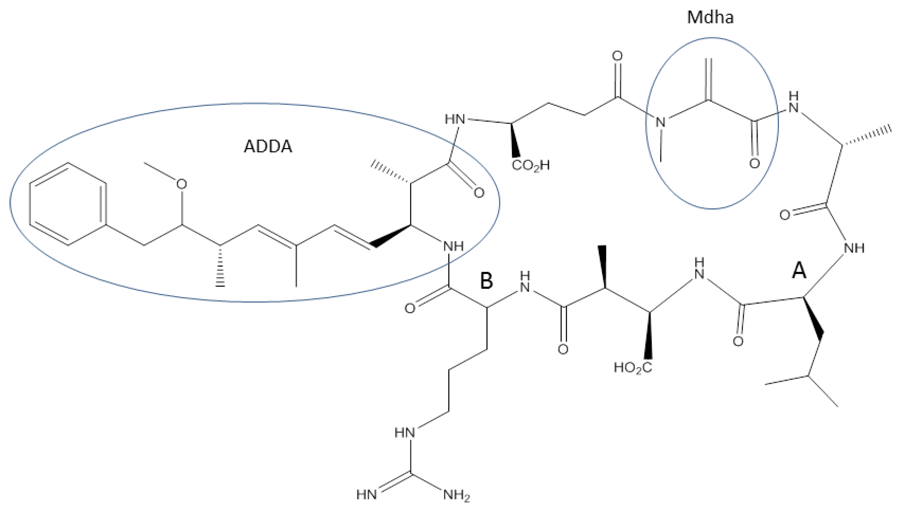 The structure of microcystin-LR. The 3-amino-9-methyoxy-2,6,8-trimethyl-10-phenyl-4,6-decadienoic (ADDA) and methyl-dehydroalanine (Mdha) groups are important in binding of microcystin-LR to the protein phosphatase enzyme. The microcystin ring system contains two variable sites (A and B), which can contain variable amino acids. This forms the basis of microcystin nomenclature. Microcystin-LR contains leucine at site A and arginine at site B, microcystin-RR contains arginine at both sites, etc.