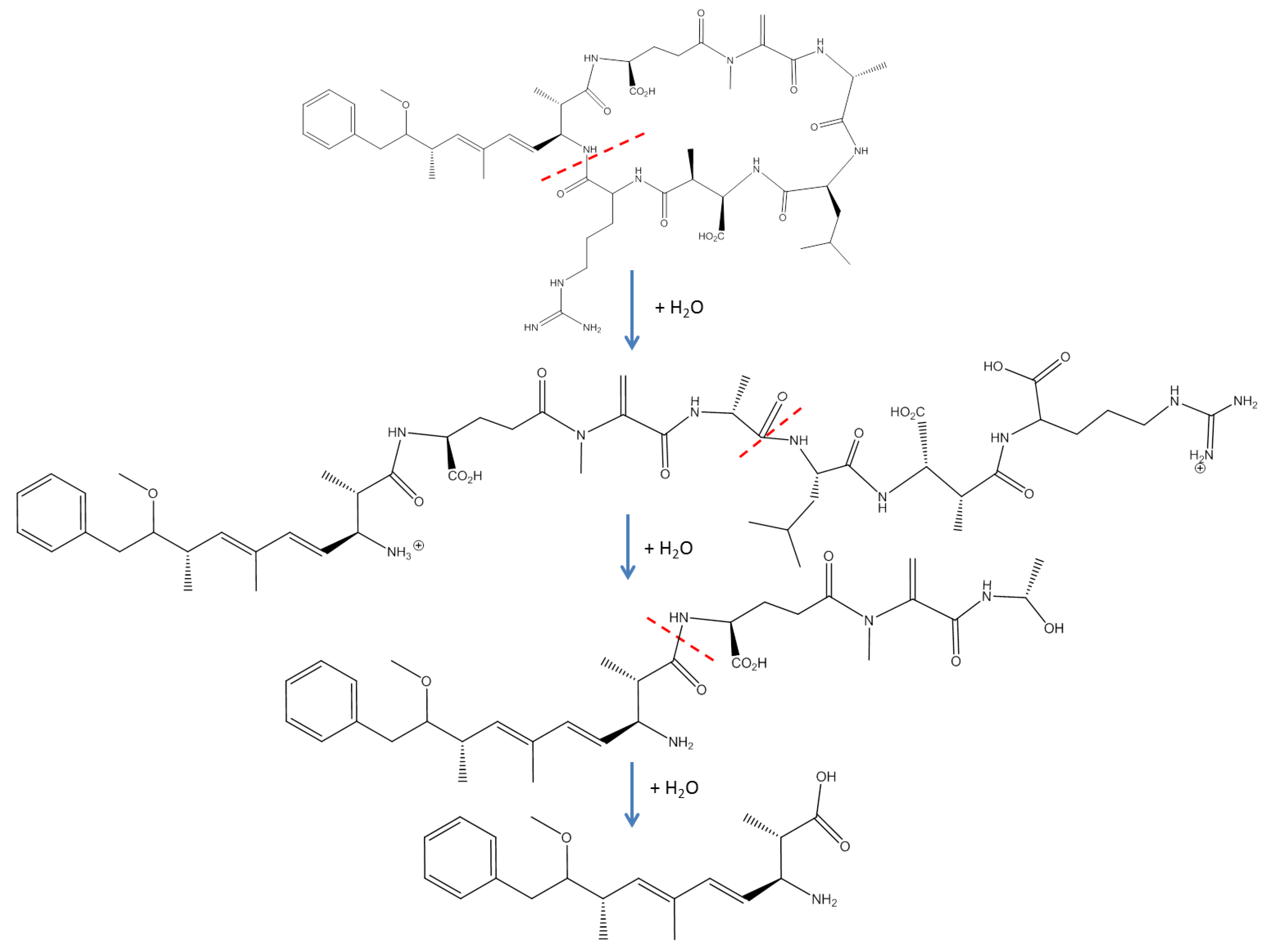 Degradation pathway of microcystin-LR by bacteria. The first step is the cleavage of the peptide ring at the ADDA-arginine bond, followed by subsequent degradation of the linear microcystin-LR product to yield a tetrapeptide intermediate and the ADDA moiety. Sites of enzymatic cleavage are indicated with dashed lines (derived from mechanism proposed by [60]).