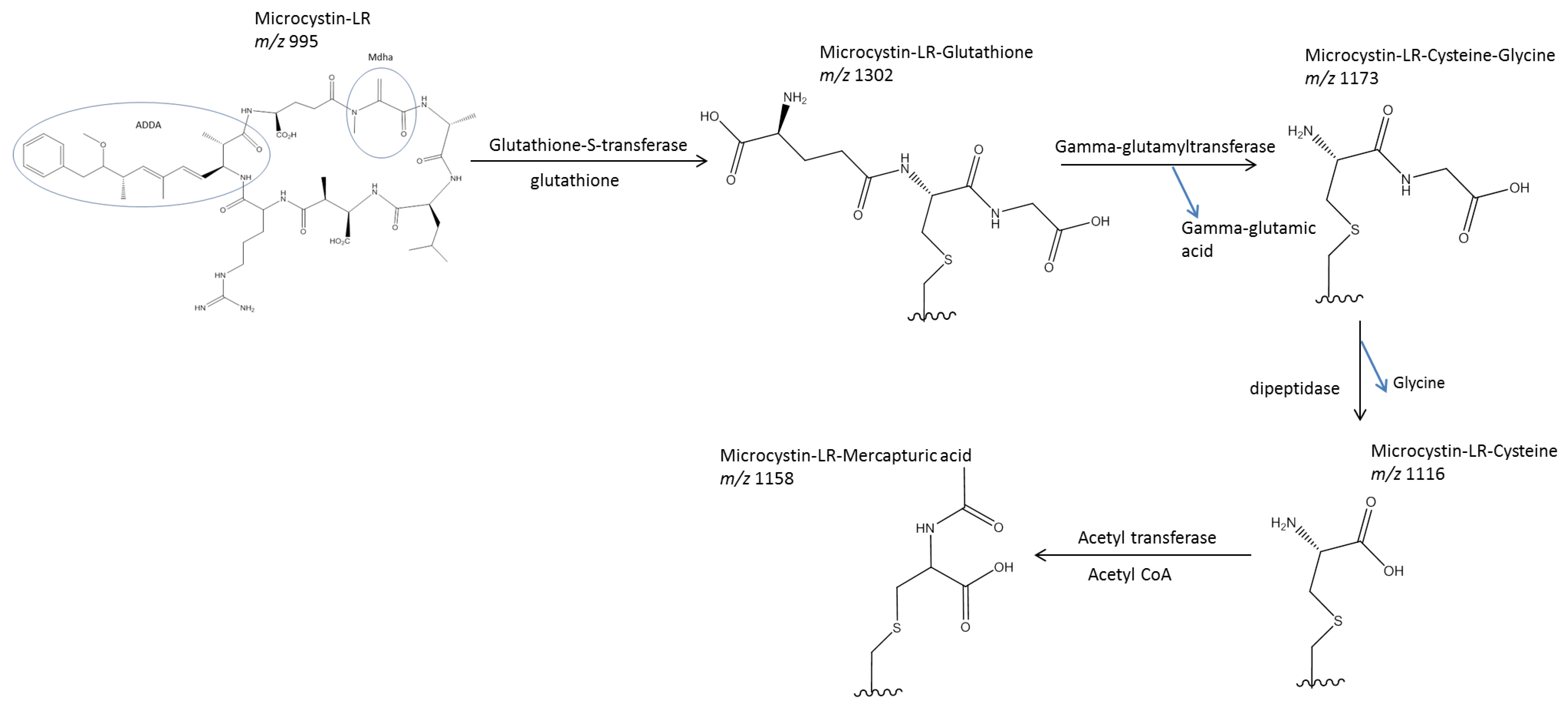 Studies on the zooplankton, Daphnia magna, the freshwater mussel, Dreissena polymorpha, and the macrophyte, Ceratophyllum demersum, suggest that the first step in the biotransformation pathway is the attachment of glutathione onto the Mdha residue of MC-LR [87,89]. This pathway is conserved between these highly diverse organisms. The glutathione conjugate is enzymatically converted into the cysteine conjugate through a cysteine-glycine intermediate. The final conjugate formed in this biochemical pathway is the mercapturic acid conjugate (Figure 3). Free (unconjugated) MC-LR can be eliminated via urine and feces in mice [96] and bivalves [97,98]. Conjugate intermediates have also been detected in feces [18] and bile [78,99,100,101] of rats. MC-LR-GSH was concentrated in feces in rats, and MC-LR-Cys was concentrated in kidneys, indicative of excretion [18]. Both the glutathione-conjugated MC-LR (MC-LR-GSH) and cysteine-conjugated microcystin-LR (MC-LR-Cys) conjugates have been identified in mice [85,102], rats [103], fish [104,105,106,107,108], shrimp [106] and snails [106]. The MC-LR-GSH conjugate has also been identified in humans [109].