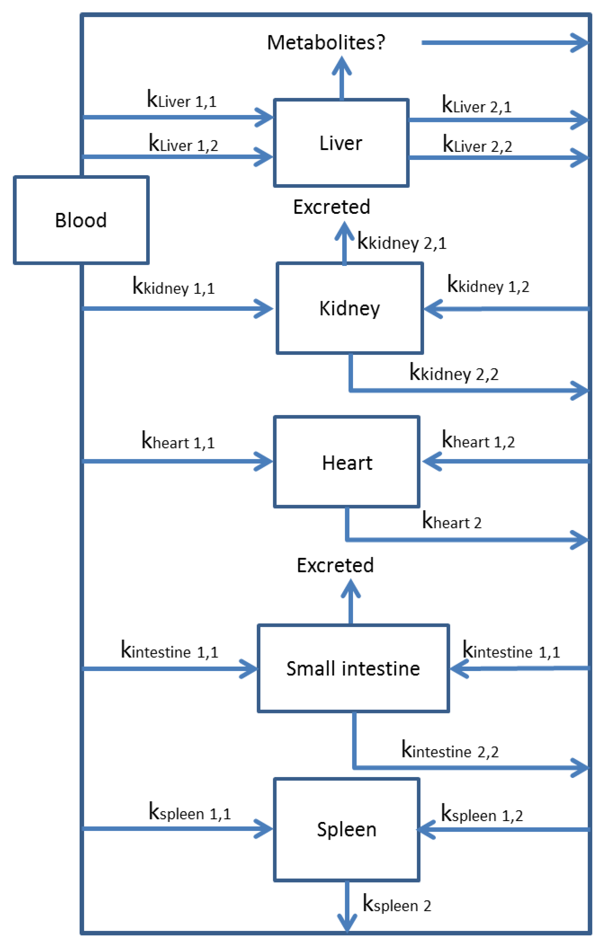 Multi-compartment model for uptake and elimination of a toxin from an organism. Multiple kinetic constants for both uptake (k1) and elimination (k2) are possible due to the circulation of metabolite products through the organism and multiple pathways for the toxin to move through. Excretion by different organs also adds additional elimination constants to the model, such as in the kidney (kkidney 2,1) and small intestine (kintestine 2,1).