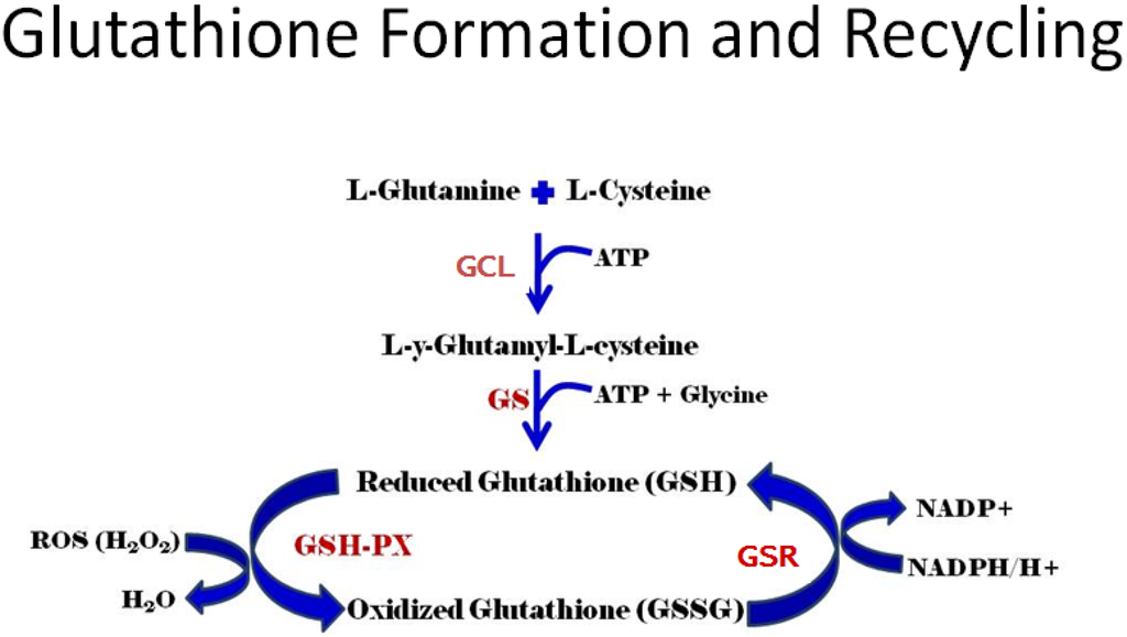 Production of GSH occurs by two mechanisms, de novo synthesis and recycling of GSSG. De novo synthesis occurs in a two-step reaction catalyzed by two separate enzymes, glutamine-cysteine ligase (GCL) and glutathione synthase (GS). The enzyme glutathione reductase (GSR) catalyzes the reduction of GSSG back to GSH. Glutathione peroxidase (GSH-PX) is a selenium-based enzyme that reduces hydrogen peroxide (H2O2) to water.