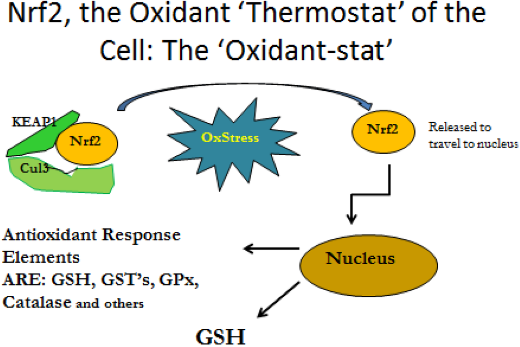 The transcription factor nuclear factor (erythroid-derived 2)-like 2 (Nrf2) plays a key role in redox regulation. Nrf2 is expressed by the majority of cell types; it is anchored in the cytosol by an inhibitory protein, Kelch-like ECH-associated protein (Keap1). During oxidative stress, Nrf2 is released and transfers to the nucleus, where it binds and activates the antioxidant response elements (ARE) and upregulates the expression of several genes associated with antioxidant defense and glutathione (GSH) synthesis.