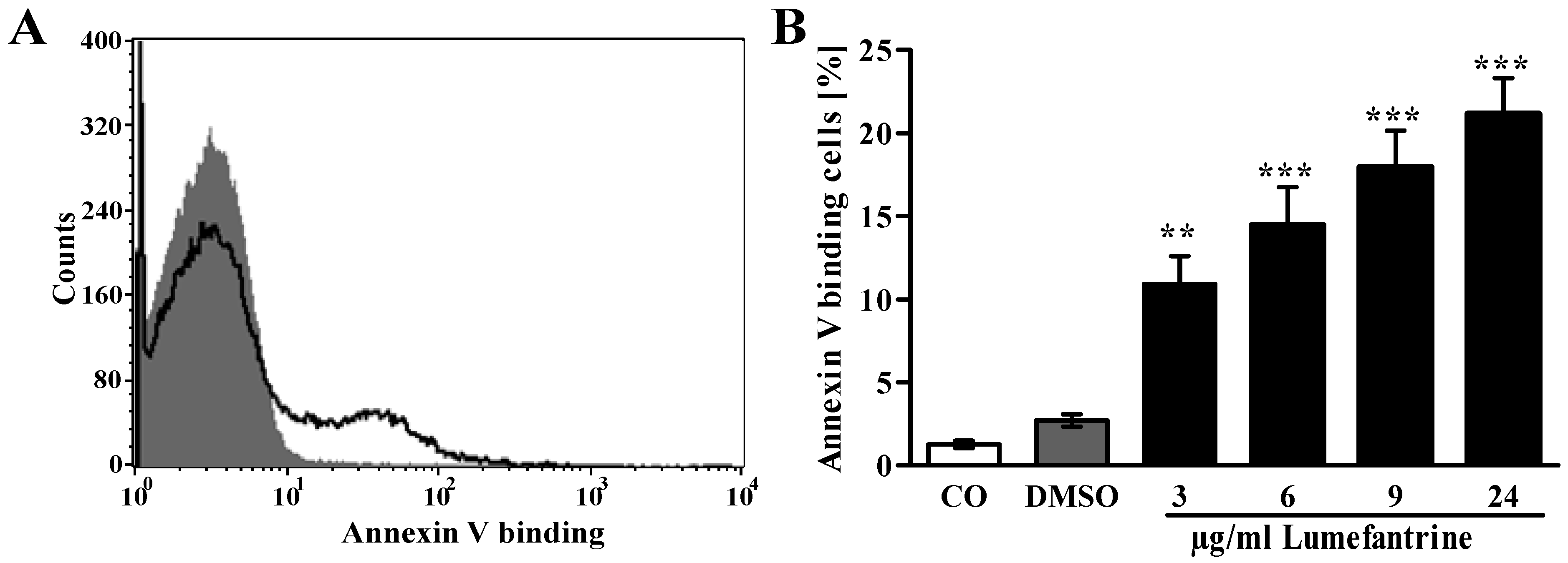 Effect of lumefantrine on phosphatidylserine exposure. (A) Original histogram of annexin V binding of erythrocytes following exposure for 48 h to Ringer solution without (grey shadow) and with (black line) presence of 24 µg/mL lumefantrine; (B) Arithmetic means ± SEM (n = 8) of erythrocyte annexin-V-binding following incubation for 48 h to Ringer solution without (white bar) or with (black bars) presence of lumefantrine (3–24 µg/mL) or, for comparison, DMSO (0.3%) alone (grey bar). ** (p < 0.01), *** (p < 0.001) indicate significant differences from the absence of lumefantrine (ANOVA).