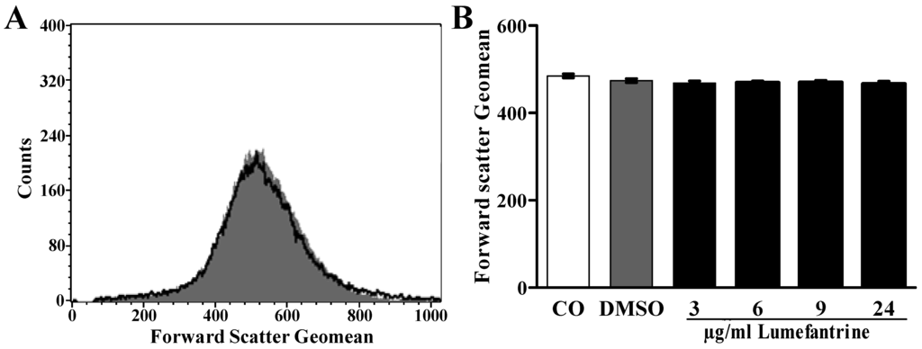 Effect of lumefantrine on erythrocyte forward scatter. (A) Original histogram of forward scatter of erythrocytes following exposure for 48 h to Ringer solution without (grey shadow) and with (black line) presence of 24 µg/mL lumefantrine; (B) Arithmetic means ± SEM (n = 8) of the normalized erythrocyte forward scatter (FSC) following incubation for 48 h to Ringer solution without (white bar) or with (black bars) lumefantrine (3–24 µg/mL) or, for comparison, DMSO (0.3%) alone (grey bar).