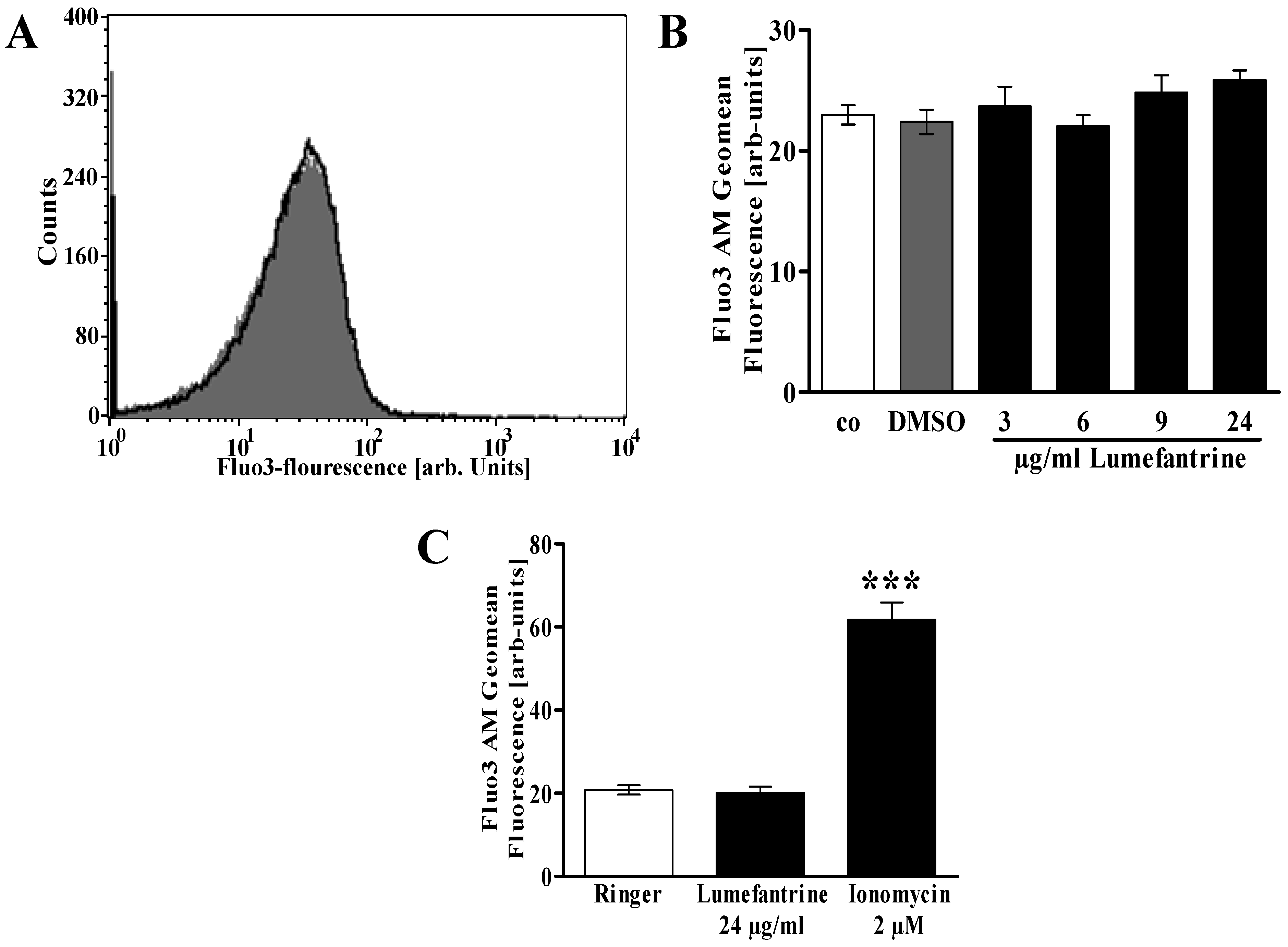 Effect of lumefantrine on erythrocyte cytosolic Ca2+ concentration. (A) Original histogram of Fluo3 fluorescence in erythrocytes following exposure for 48 h to Ringer solution without (grey shadow) and with (black line) presence of 24 µg/mL lumefantrine; (B) Arithmetic means ± SEM (n = 8) of the Fluo3 fluorescence (arbitrary units) in erythrocytes exposed for 48 h to Ringer solution without (white bar) or with (black bars) lumefantrine (3–24 µg/mL) or, for comparison, DMSO (0.3%) alone (grey bar); (C) Arithmetic means ± SEM (n = 4) of the Fluo3 fluorescence (arbitrary units) in erythrocytes exposed for 48 h to Ringer solution without (white bar) or with 24 µg/mL lumefantrine (black bar) or, for comparison, 2 µM ionomycin (grey bar). *** (p < 0.001) indicates significant difference from the absence of ionomycin (ANOVA).