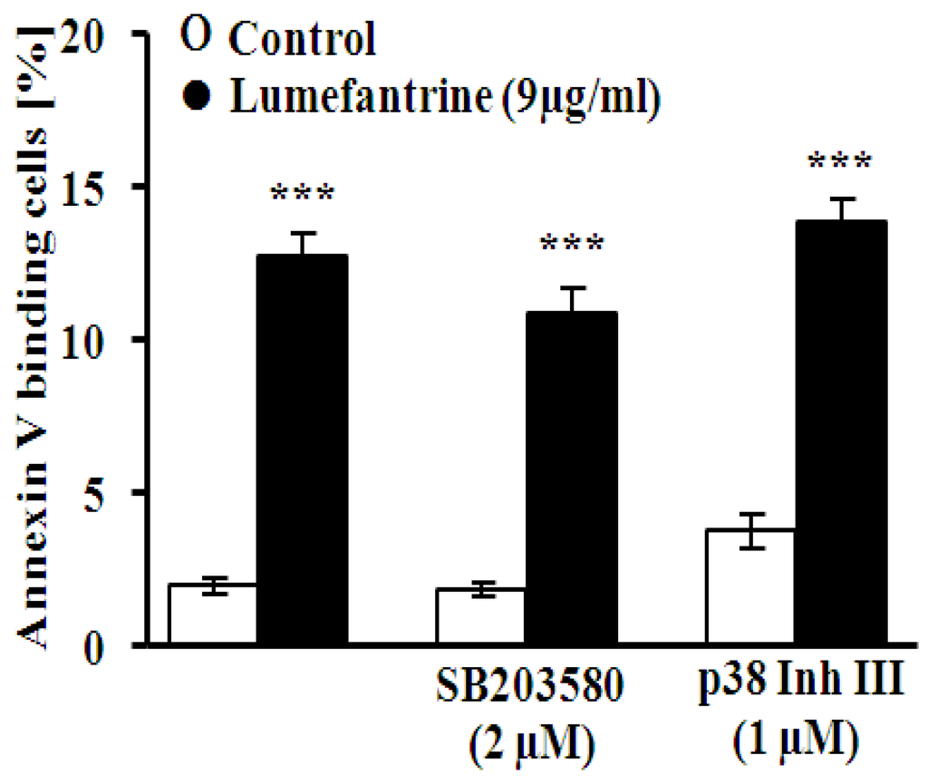 An additional series of experiments was performed in order to explore whether the effect of lumefantrine on cell membrane scrambling required activation of p38 kinase. To this end, erythrocytes were exposed to 9 µg/mL lumefantrine for 48 h, either in the absence or presence of the p38 kinase inhibitors SB203580 (SB, 2 μM) and p38 Inh III (Inh, 1 μM). As illustrated in Figure 4, neither SB203580 nor p38 Inh III significantly modified the effect of lumefantrine on annexin V binding.