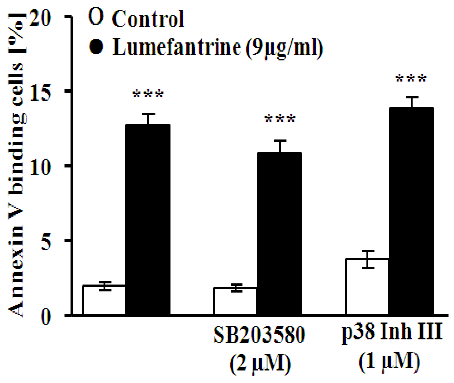 Effect of p38 kinase inhibitors on lumefantrine- induced annexin-V-binding. Arithmetic means ± SEM (n = 8) of the percentage of annexin-V-binding erythrocytes after a 48 h treatment with Ringer solution without (white bar) or with (black bars) 9 µg/mL lumefantrine in the absence (left bars) and presence of the p38 kinase inhibitors SB203580 (SB, 2 μM, middle bars) and p38 Inh III (Inh, 1 μM, right bars). *** (p < 0.001) indicates significant difference from the absence of lumefantrine (ANOVA).
