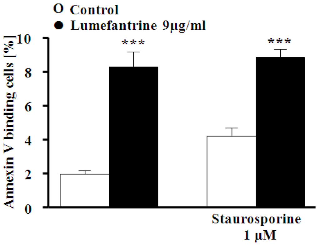 In order to test for an involvement of protein kinase C (PKC), erythrocytes were exposed to 9 µg/mL lumefantrine for 48 h either in the absence or presence of the unspecific PKC inhibitor staurosporine (1 μM). As illustrated in Figure 5, staurosporine did not significantly modify the effect of lumefantrine on annexin V binding.