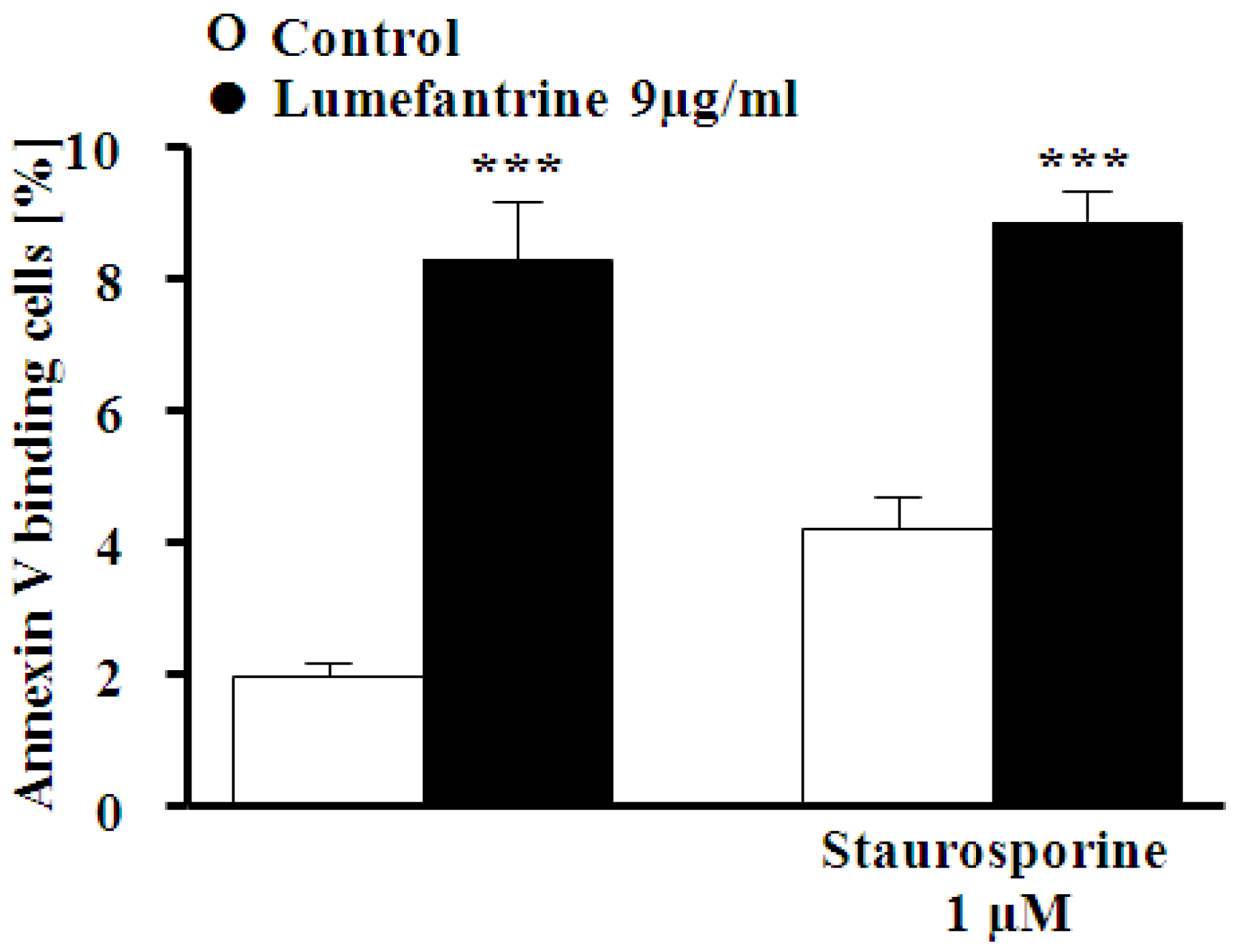 Effect of staurosporine on lumefantrine- induced annexin-V-binding. Arithmetic means ± SEM (n = 4) of the percentage of annexin-V-binding erythrocytes after a 48 h treatment with Ringer solution without (white bars) or with (black bars) 9 µg/mL lumefantrine in the absence (left bars) and presence (right bars) of PKC inhibitor staurosporine (1 μM). *** (p < 0.001) indicates significant difference from the absence of lumefantrine (ANOVA).