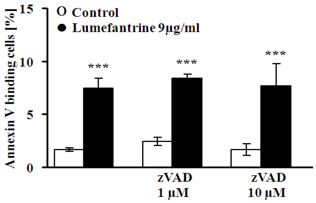 A further series of experiments addressed the putative involvement of caspases. To this end, erythrocytes were exposed to 9 µg/mL lumefantrine for 48 h either in the absence or presence of the pancaspase inhibitor zVAD (1 or 10 μM). As illustrated in Figure 6, zVAD did not significantly modify the effect of lumefantrine on annexin V binding.