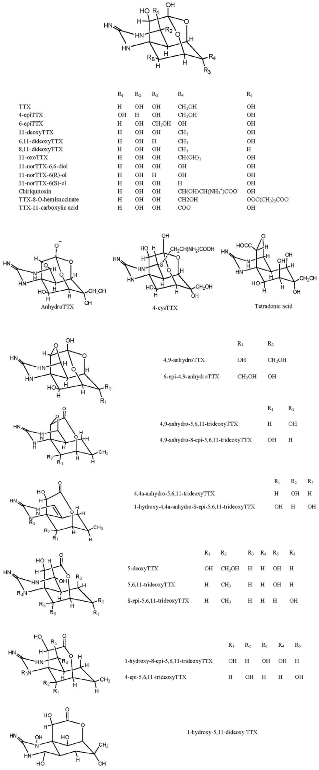 Apart from the commercially available standards given, very few of the isolated TTX analogues or derivatives listed, are available in sufficient quantities to allow for the development and implementation of widespread screening by quantitative analytical methods.