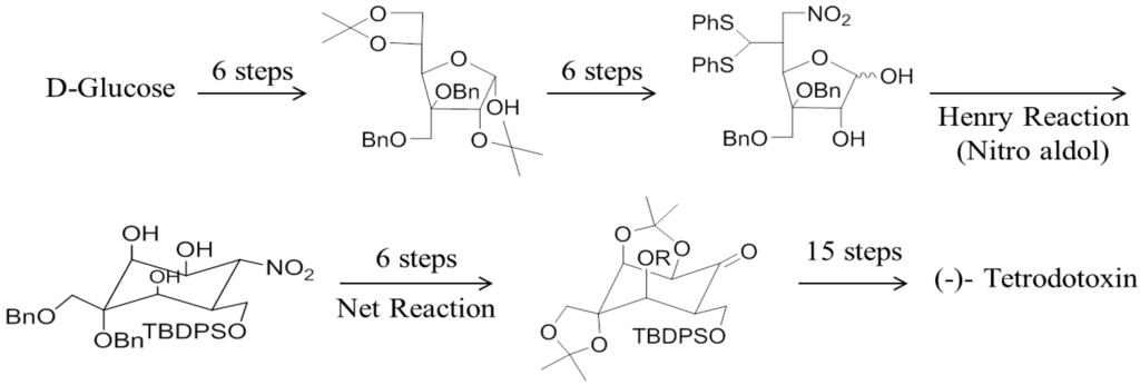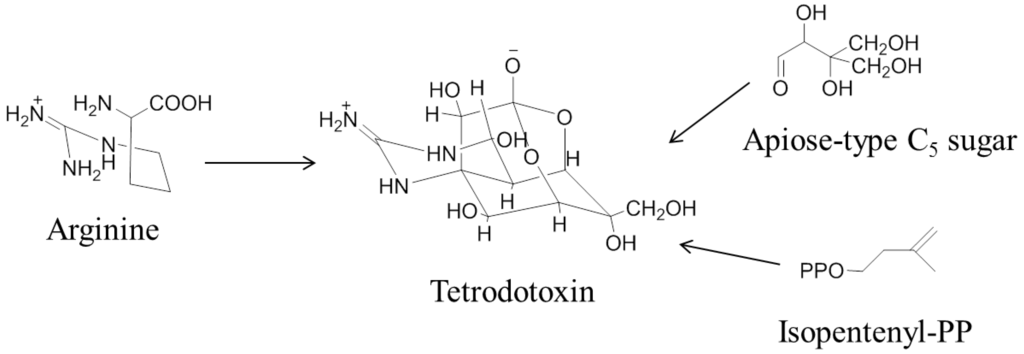 Yotsu-Yamashita et al., 1999 synthesized eight derivatives of TTX by chemical modifications of TTX extracted from the puffer fishes, Fugu poecilonotus and Fugu pardalis: 11-oxoTTX, TTX-11-carboxylic acid, 11-norTTX-6,6-diol, 11-norTTX-6(S)-ol, 11-norTTX-6(R)-ol, tetrodonic acid, 4,9-anhydro-8-O-hemisaccinate and TTX-8-O-hemisaccinate. Though these were just one or two step chemical reactions, the percentage yields of each derivative were 5%, 7%, 73%, 14%, 4%, 75%, 40% and 34% respectively [112].