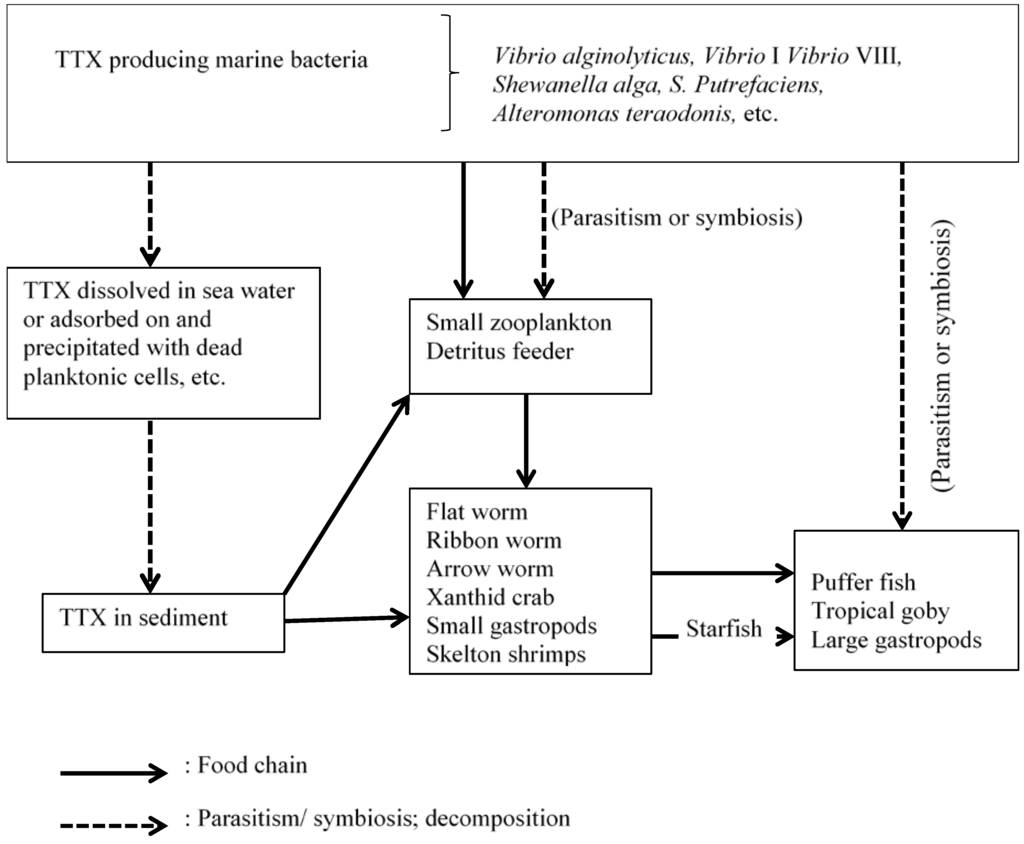 There is some conjecture as to the origin of TTX in puffer fish. It has been shown that cultured non-toxic puffer fish when fed on a diet containing TTX become toxic [89] and toxic puffer fish when fed on a TTX-free diet become non-toxic [90]. It has also been demonstrated that the source of TTX in puffer fish is an endo-symbiotic bacteria that naturally inhabits the gut of the animal [81,82,87,88,91,92]. This may be explained by the hypothesis that puffer fish could initially acquire the TTX producing bacteria via the food web and that these bacteria then persist in the fish [93]. Indeed several ubiquitous varieties of bacteria produce TTX including some in the Pseudomonas and Vibrio genera [21,80,81,82,83,84,85,86,87,88,91,92,94,95]. Origin of TTX in terrestrial animal’s, for example newt and frog is endogenous because it has role in defense from predators in these animals (Refer to paragraph 4.3).