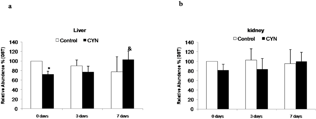 sGST protein abundance decreased in the liver and did not show changes in the kidney. The reduction observed in the liver is in accordance with a well-known toxic mechanism of CYN, the inhibition of protein synthesis [48,49]. Thus, Humpage et al. [50] reported that the CYN parent compound was responsible for the inhibition of protein synthesis. This result is not in agreement with previous studies performed by Puerto et al. [13] and Gutiérrez-Praena et al. [21]. However, in those studies only a single dose of pure CYN was used and the observation period was shorter. The authors suggested that the dose employed was not enough or that the effect might need more time to be observed in vivo. In this regard, Kinnear [7] reported that CYN had a delayed toxicity involving multiple organ systems, principally the liver and kidneys. In this case, the continued exposure to CYN-containing cultures (equivalent to 10 µg CYN/L) for 14 days was enough to induce this toxic effect.