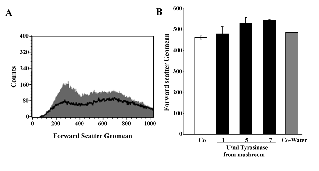 A second hallmark of eryptosis is cell shrinkage. Accordingly, cell volume was estimated utilizing forward scatter, which was determined by flow cytometry. As shown in Figure 2, a 24-h exposure to tyrosinase tended to increase erythrocyte forward scatter, an effect, however, not reaching statistical significance. Further experiments were performed to elucidate whether tyrosinase abrogates the effect of the Ca2+ ionophore inomomycin (1 µM) on erythrocytes forward scatter. As a result, a 30-min exposure of erythrocytes was followed by a decrease of forward scatter from 518 ± 6 (n = 4) to 134 ± 5 (n = 4) in the absence of tyrosinase and from 557 ± 8 (n = 4) to 194 ± 16 (n = 4) in the presence of 7 U/mL tyrosinase. Thus, tyrosinase did not abrogate the shrinking effect of excessive Ca2+ entry.
