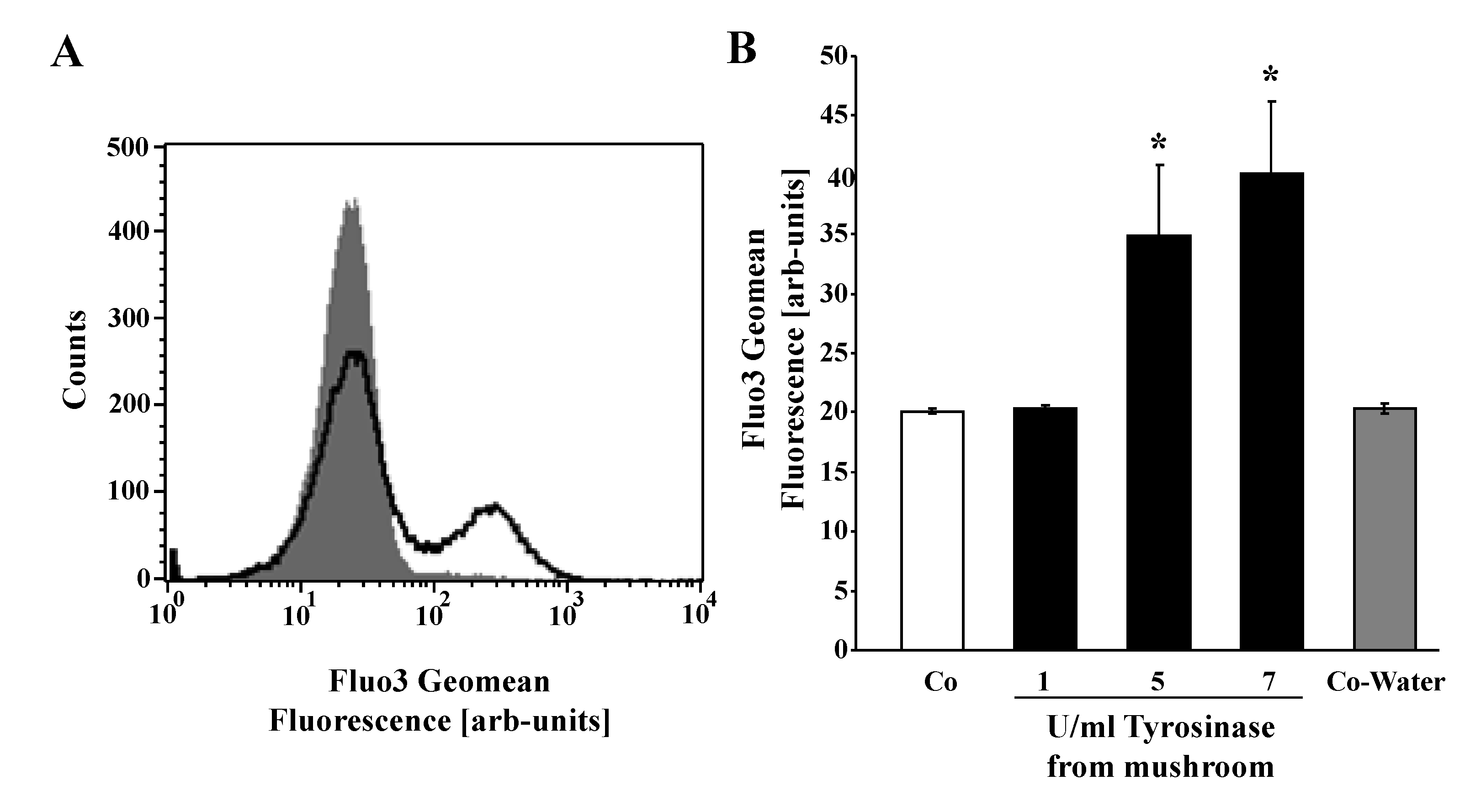 Effect of mushroom tyrosinase on erythrocyte cytosolic Ca2+ concentration. (A) Original histogram of Fluo3 fluorescence in erythrocytes following exposure for 24 h to Ringer solution without (grey shadow) and with (black line) presence of 7 U/mL tyrosinase; (B) arithmetic means ± SEM (n = 4) of the Fluo3 fluorescence (arbitrary units) in erythrocytes exposed for 24 h to Ringer solution without (white bar) or with (black bars) tyrosinase (1–7 U/mL). * (p < 0.05) indicates significant difference from the absence of tyrosinase (ANOVA).